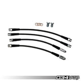 This 034Motorsport Stainless Steel Braided Brake Line Kit features teflon linings, stainless steel braided reinforcement and a protective black PVC covering. All lines are Manufactured to Meet or Exceed DOT Test and Construction Standards.