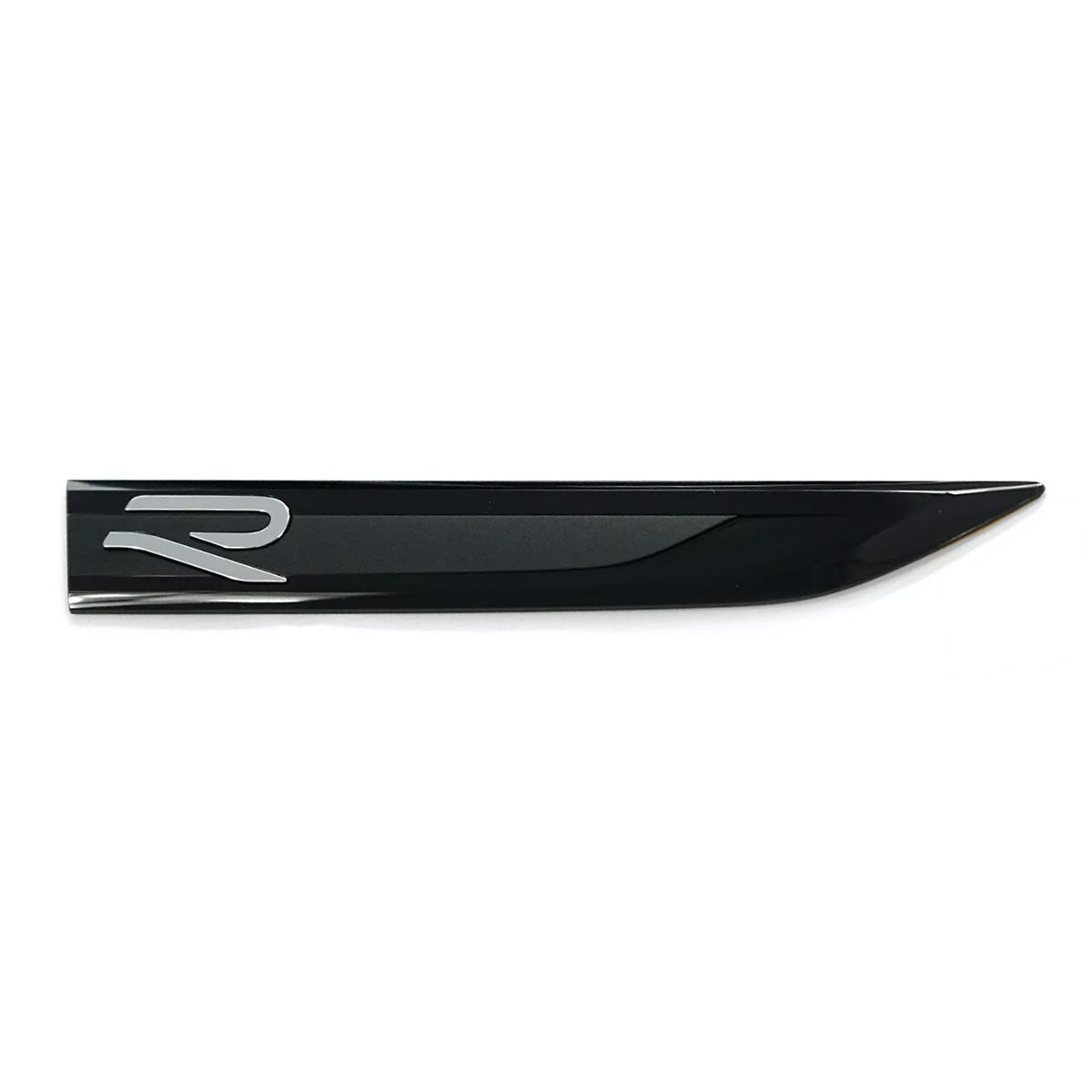 Genuine VW Mk8 Golf R side fender badge/emblem with a black background and a chrome R. This listing is for the right side badge/emblem only.