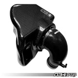 The X34 Carbon Fiber Intake System for B9 Audi A4/Allroad and A5 was engineered with performance in mind, and is a free-flowing replacement for the factory airbox and turbocharger inlet hose. As the fruition of this design approach, the X34 Carbon Fiber Intake System yields a measurable reduction in pressure drop at the turbo inlet compared to the factory airbox, with a corresponding increase in horsepower and torque throughout the powerband.