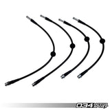 This 034Motorsport Stainless Steel Braided Brake Line Kit features teflon linings, stainless steel braided reinforcement and a protective black PVC covering. All lines are manufactured to meet or exceed DOT Test and construction standards.