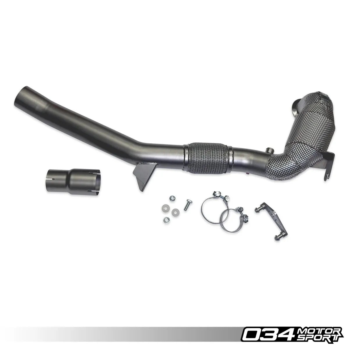 The 034Motorsport Stainless Steel Racing Downpipe for the Mk8 GTI is the ultimate upgrade over the factory downpipe. Offering increased horsepower and torque throughout the powerband, reduced turbocharger lag, and an enhanced exhaust note, this is the ultimate downpipe solution for the discerning Volkswagen enthusiast. Optimized for increased flow and maximum performance, the MQB-Evo 2.0T Cast Stainless Steel Racing Downpipe features organic geometry and a Euro4 300-Cell racing catalytic converter in the factory location. This complete downpipe solution includes an integrated v-band flange at the turbine outlet, integrated oxygen sensor bung after the catalyst, OEM-style corrugated flex bellow, and factory-location exhaust hanger. The MQB-Evo 2.0T Stainless Steel Racing Downpipe is constructed from 304 stainless steel and TIG-welded & back-purged for maximum durability and a titanium look finish for maximum corrosion resistance, and includes an integrated OE-style heat isolation barrier to minimize exhaust heat transferred into the engine bay.