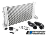 The intercooler kit includes the direct-fit core, heavy duty black silicone hoses, billet adapter to connect the silicone hose to your OEM turbo outlet pipe, clamps, and necessary bolts and washers.
