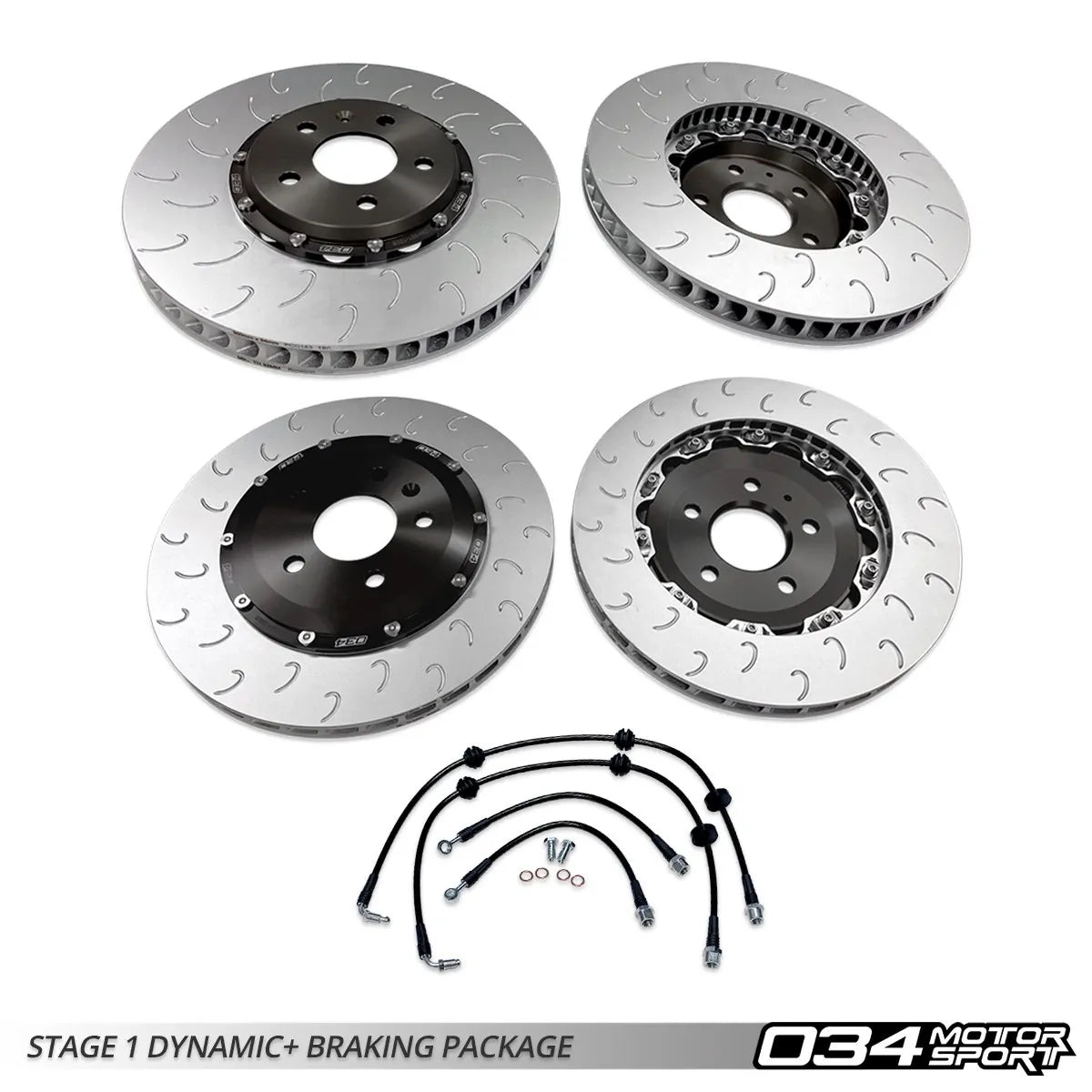 Want an OEM+ upgrade to improve braking performance while retaining the factory caliper setup? 034Motorsport’s Dynamic+ Stage 1 Braking Package is the ideal upgrade as the package includes our 2-Piece Floating Front and Rear Rotors, which utilize 72 curved vanes to provide superior cooling efficiency and more consistent braking performance while reducing rotational mass over the incorrectly veined, inefficiently cooled factory rotors. Topping it all off is our Stainless Steel Brake Lines, which remove the factory rubber lines that expand and contract under hard braking for robust stainless steel lines, improving brake pedal feel and consistent braking performance.