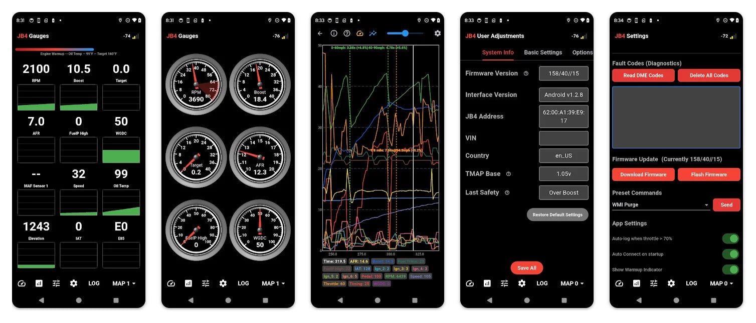 The all-new JB4PRO free app, which runs exclusively on our new adapter was designed from the ground up in-house for ease of use, simplicity, and reliability. Able to operate fully offline, it includes all the features you've come to expect from a JB4 app, including map switching, live data monitoring, auto logging, read/delete fault codes, firmware updates, setting changes, and more. Burger Motorsport has also added useful help functions to describe what the settings do, performance metrics and analysis tools so you can evaluate your car's performance, GPS elevation/speed as a logging channel, and often requested functions such as "restore default settings."