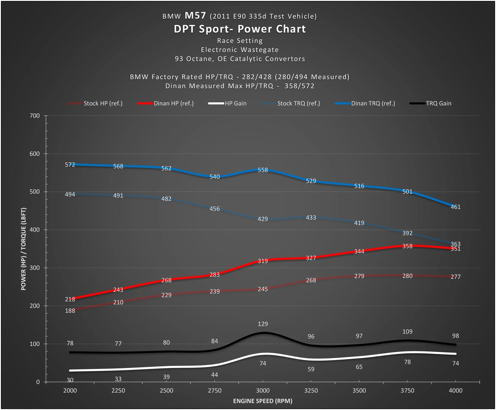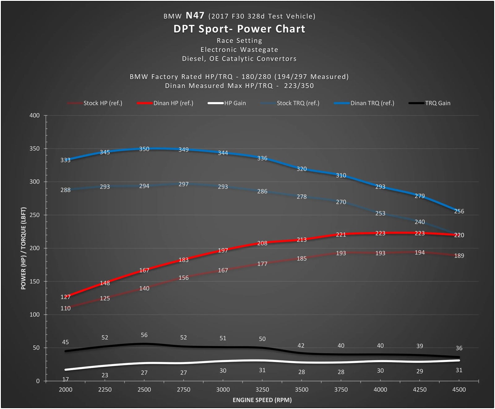 - DINANTRONICS Sport Maximum Gains (N47): Up to 30 HP, 50 lb-ft of torque.