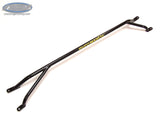 The triangulated design of Eurosport upper-front stress bars help to eliminate the roll and twist of the front sheet metal frame. Construction consists of heavy wall 7/8" and 3/4" diameter steel tubing and is welded to 1/4" thick steel mounting plates. Finished in gloss black powder coat. Euro Sport upper-front stress bars require no cutting of the firewall or body modifications.