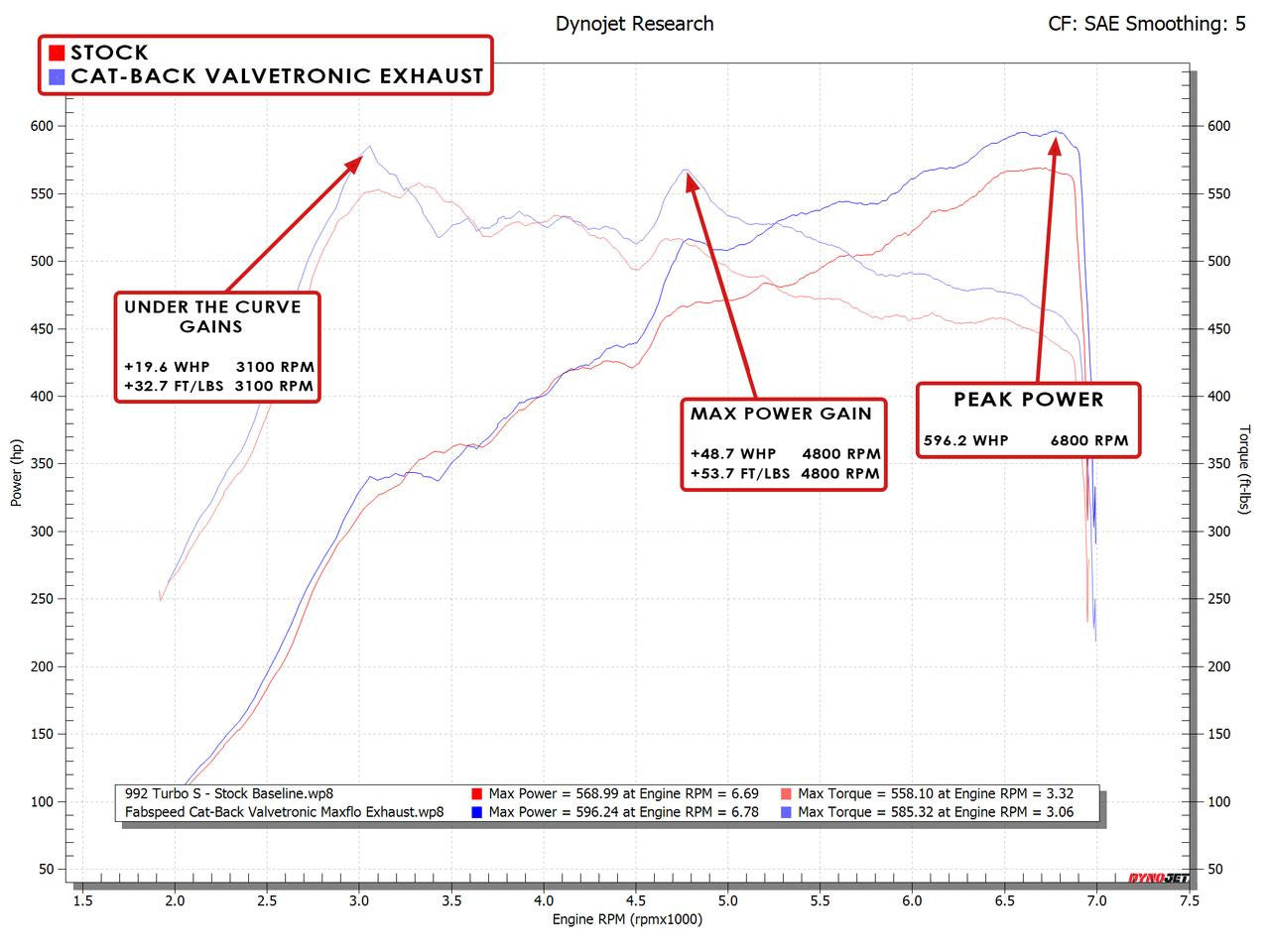 With PSE on and valves open, the Cat-Back Valvetronic Maxflo Exhaust turns your 992's exhaust note into a true neck-breaker with a significant increase in volume. Get a deep tone and aggressive pops on downshift as well as turbo spooling sounds. With PSE off and the valves closed the exhaust note is tame and totally drone-free. In-cabin conversations are just as easy as they were with the stock exhaust.