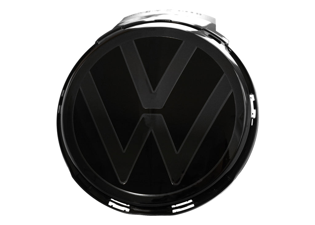 Genuine VW Mk8.5 Golf R Black Edition front grill VW emblem. Unlike other Golf R models, this version is black instead of chrome. This emblem will light up on Mk8.5 models equipped with this option.